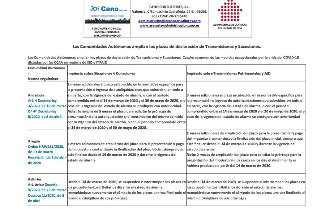 Cuadro resumen de las medidas excepcionales por la crisis del COVID-19 . SUCESIONES Y DONACIONES